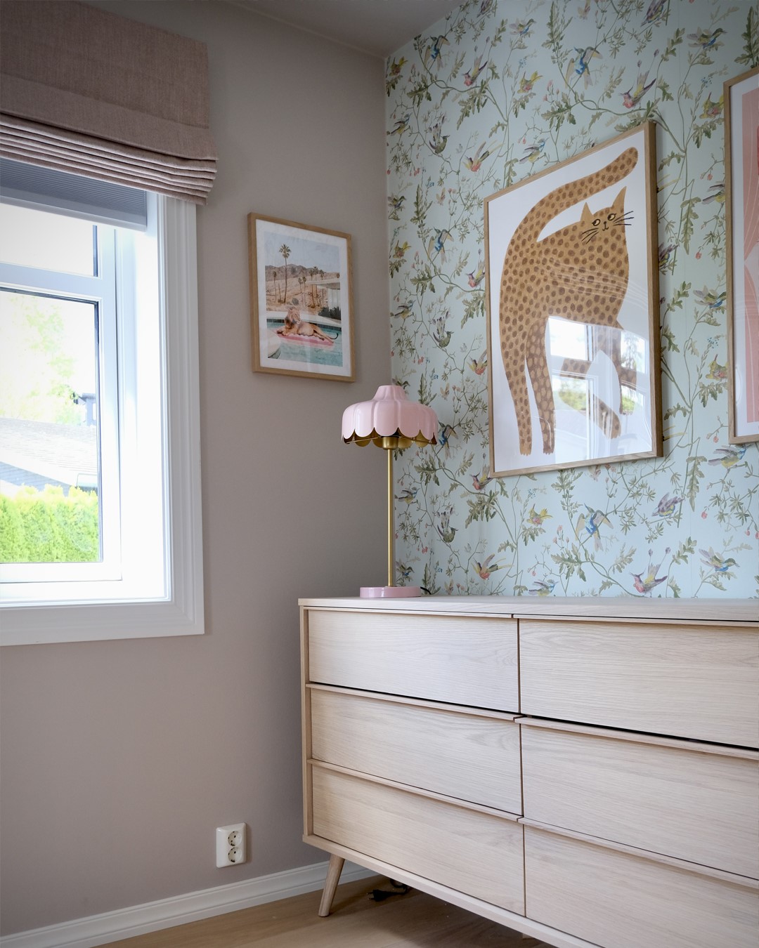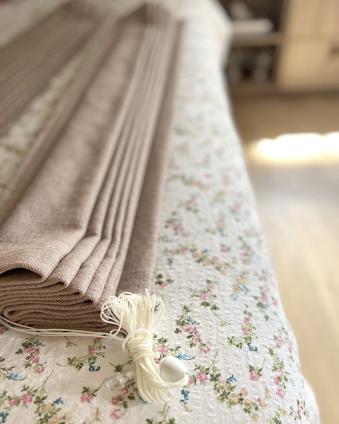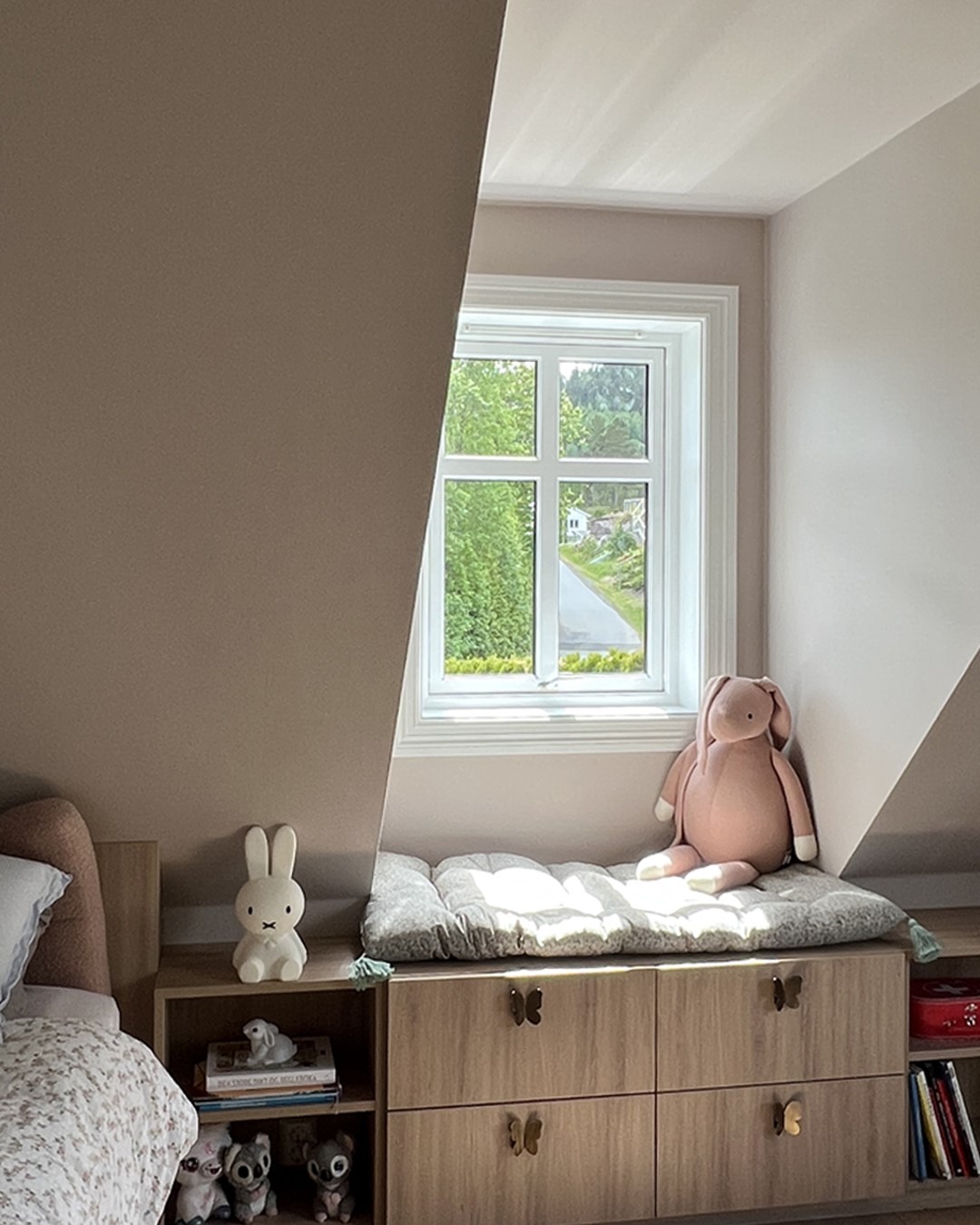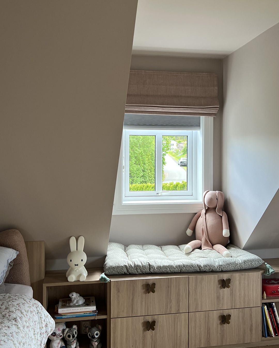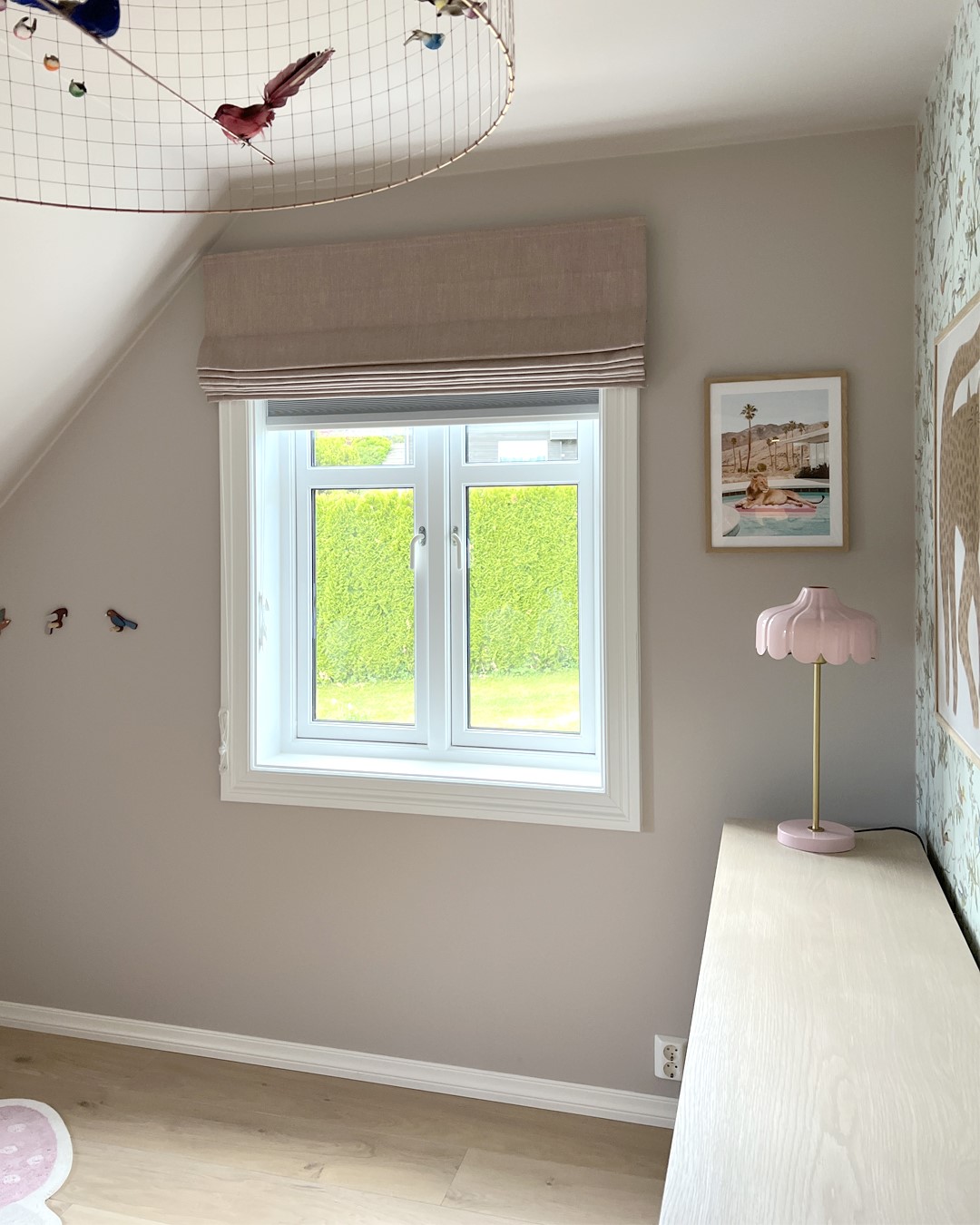 På soverommet har stylist Berit Vildalen valgt skreddersydde, lystette liftgardiner som harmonerer med soverommets fargepalett.