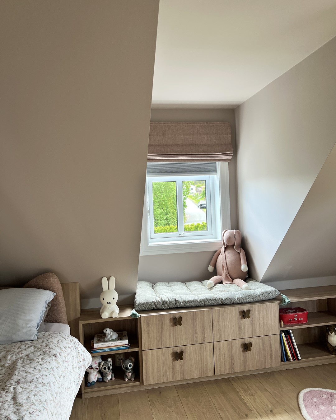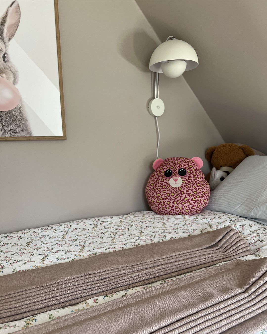 Oppdag Charlottes soverom med en dobbel gardinskinne og to lag gardiner, og en lystett liftgardin, for et avslappet miljø med optimal lyskontroll.