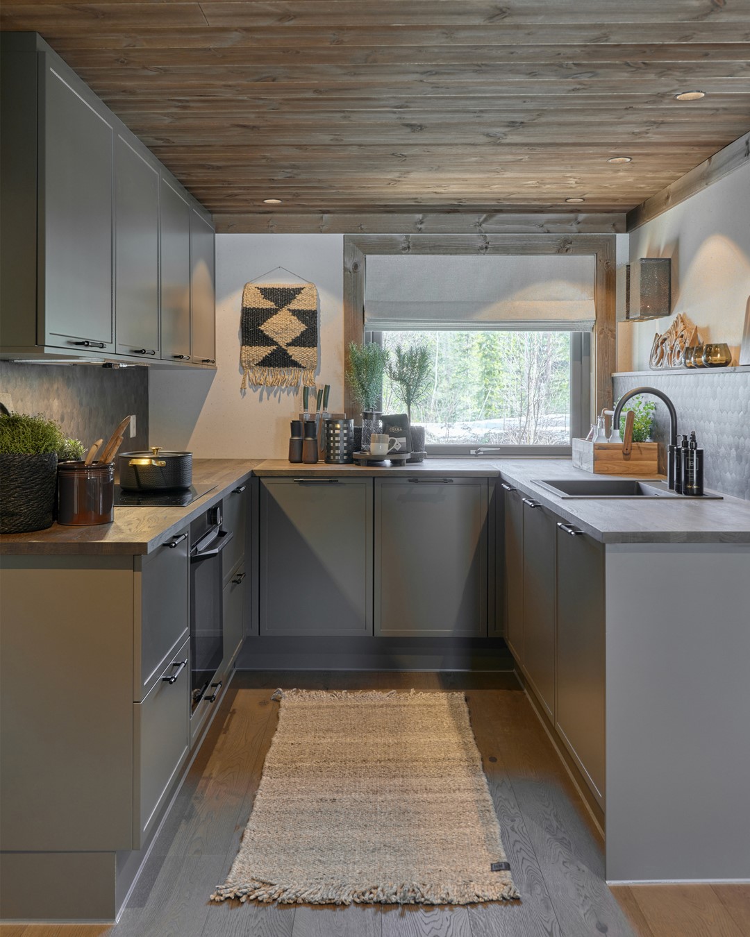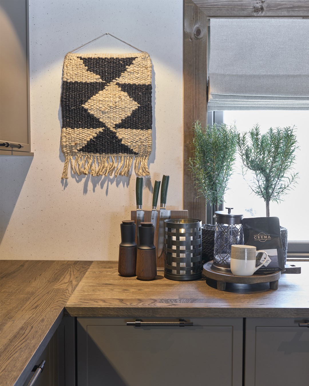 Liftgardin og tekstiler gir et funksjonelt og lunt kjøkken i Setesdalhytta med plass til samvær og matlaging