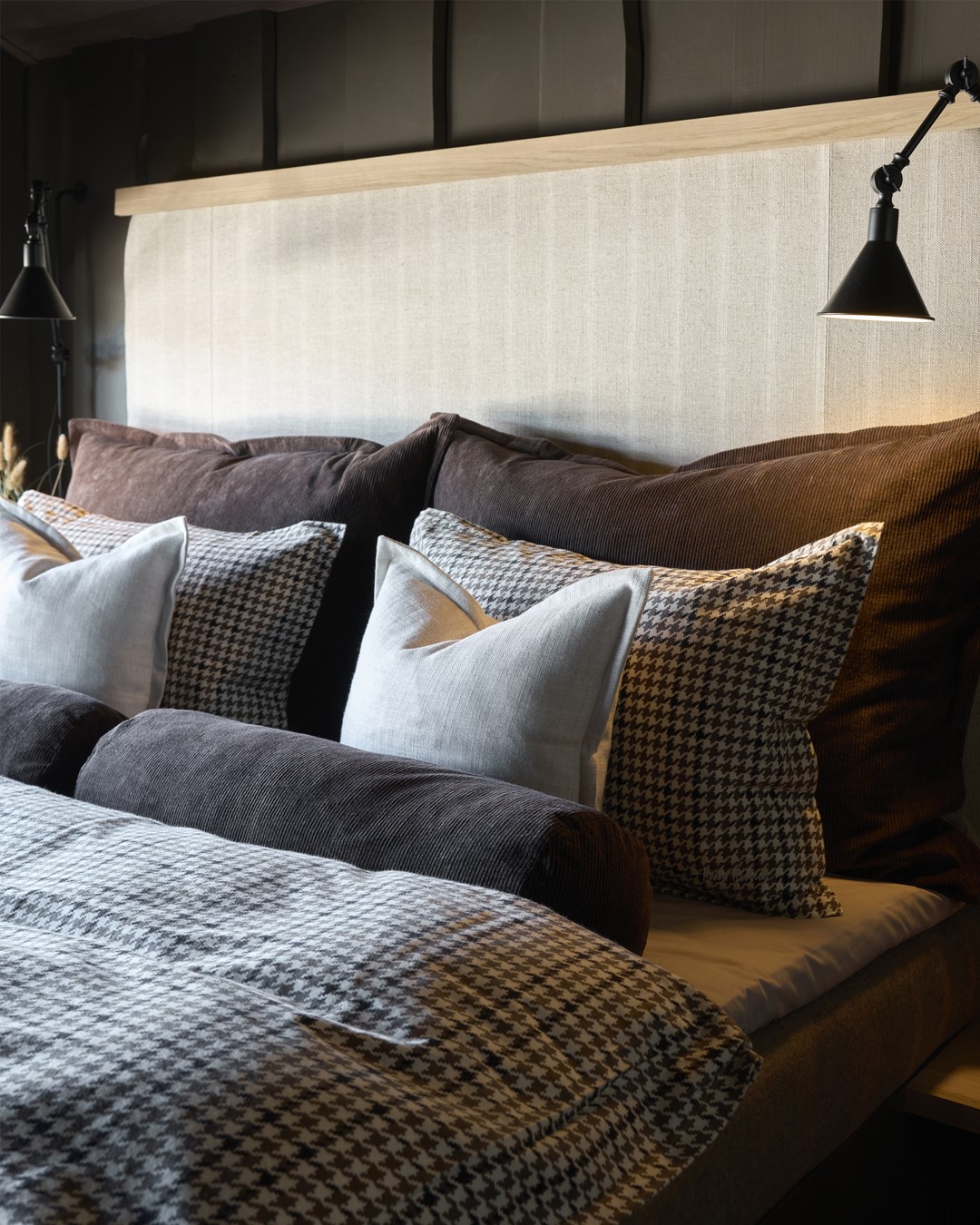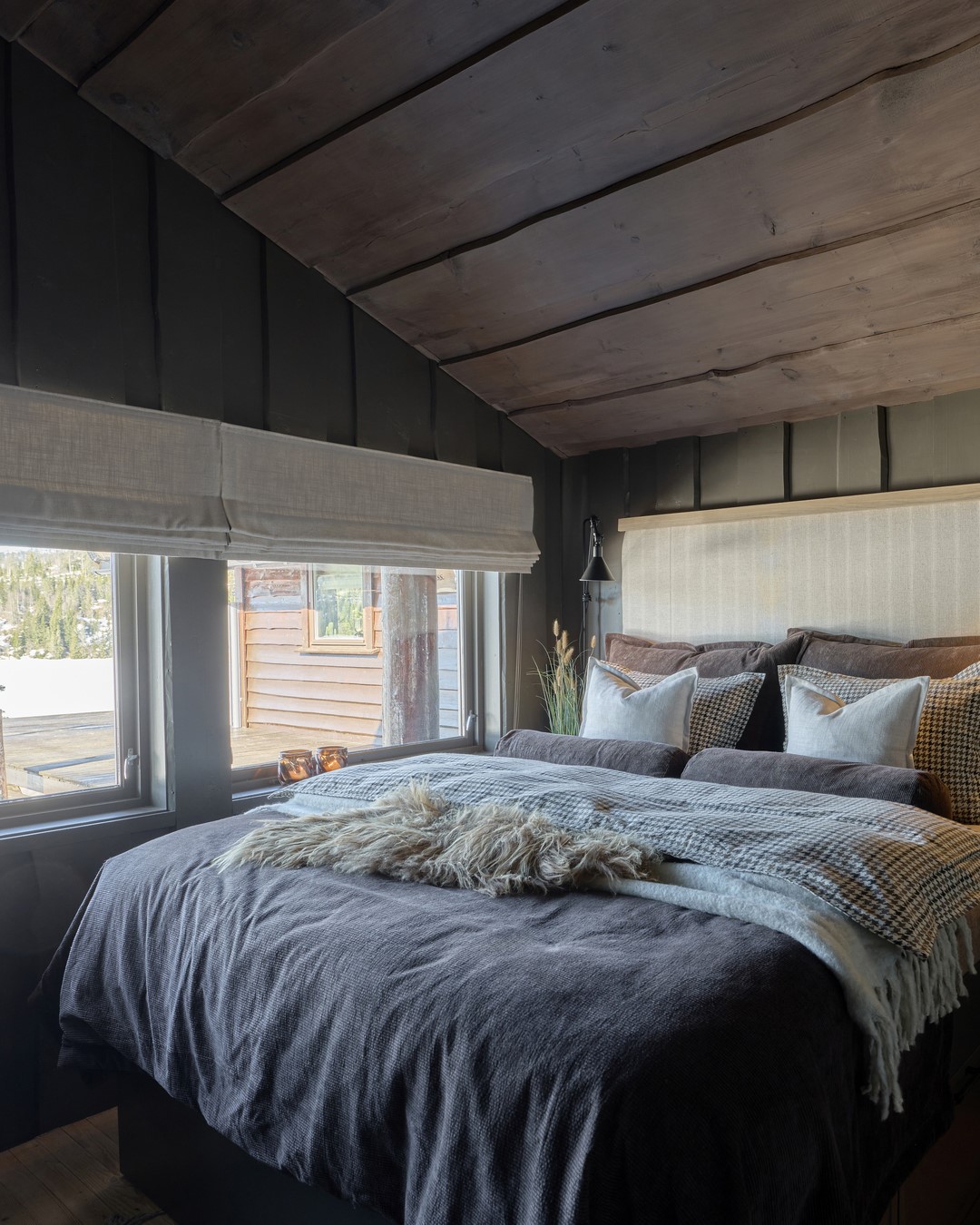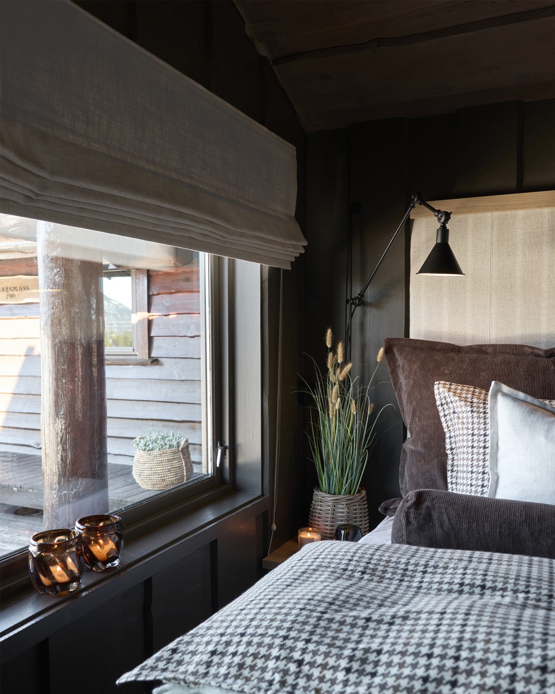Lystette liftgardiner, sengegavl og tekstiler gir varm atmosfære og helhet i anneksets nye soverom i Setesdal-hytta.
