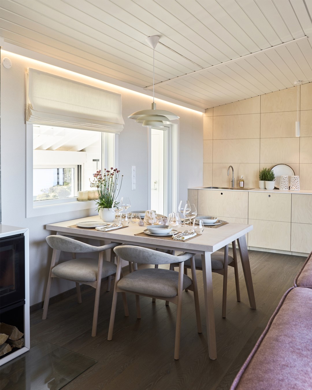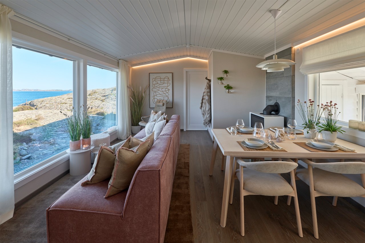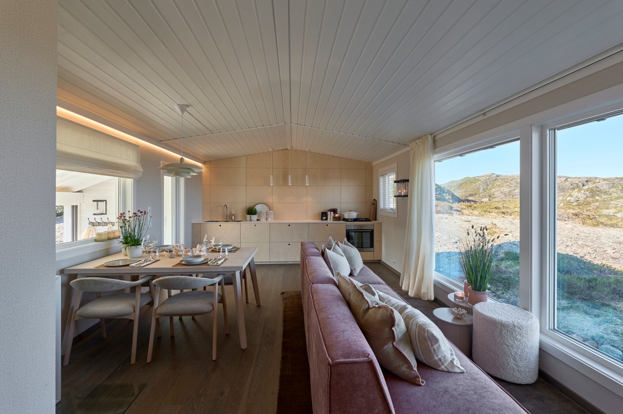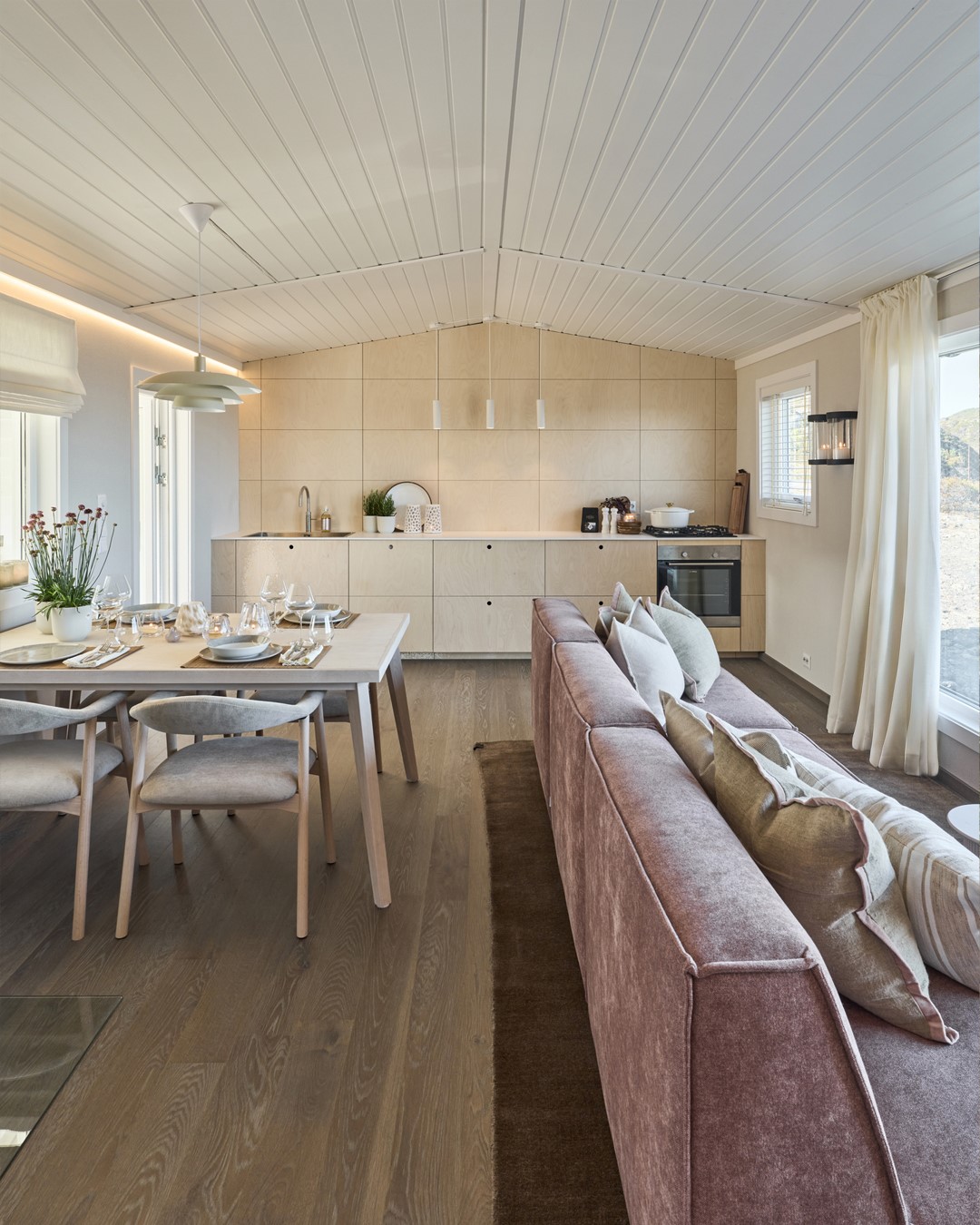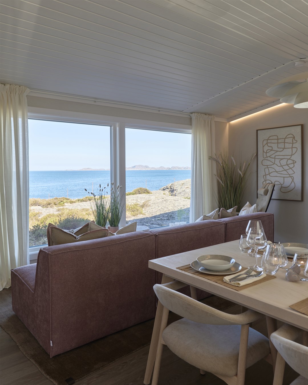 Halvor & Co forvandler «Brygga» i Lofoten med lun skandinavisk stil, der gardiner brune med wavefold skaper en koselig atmosfære.