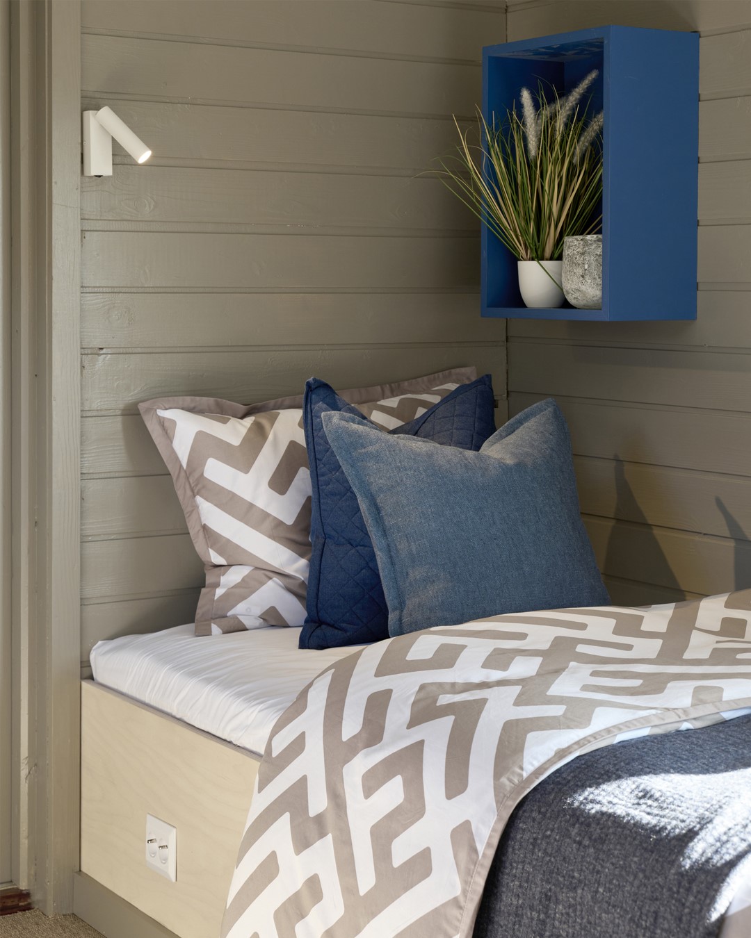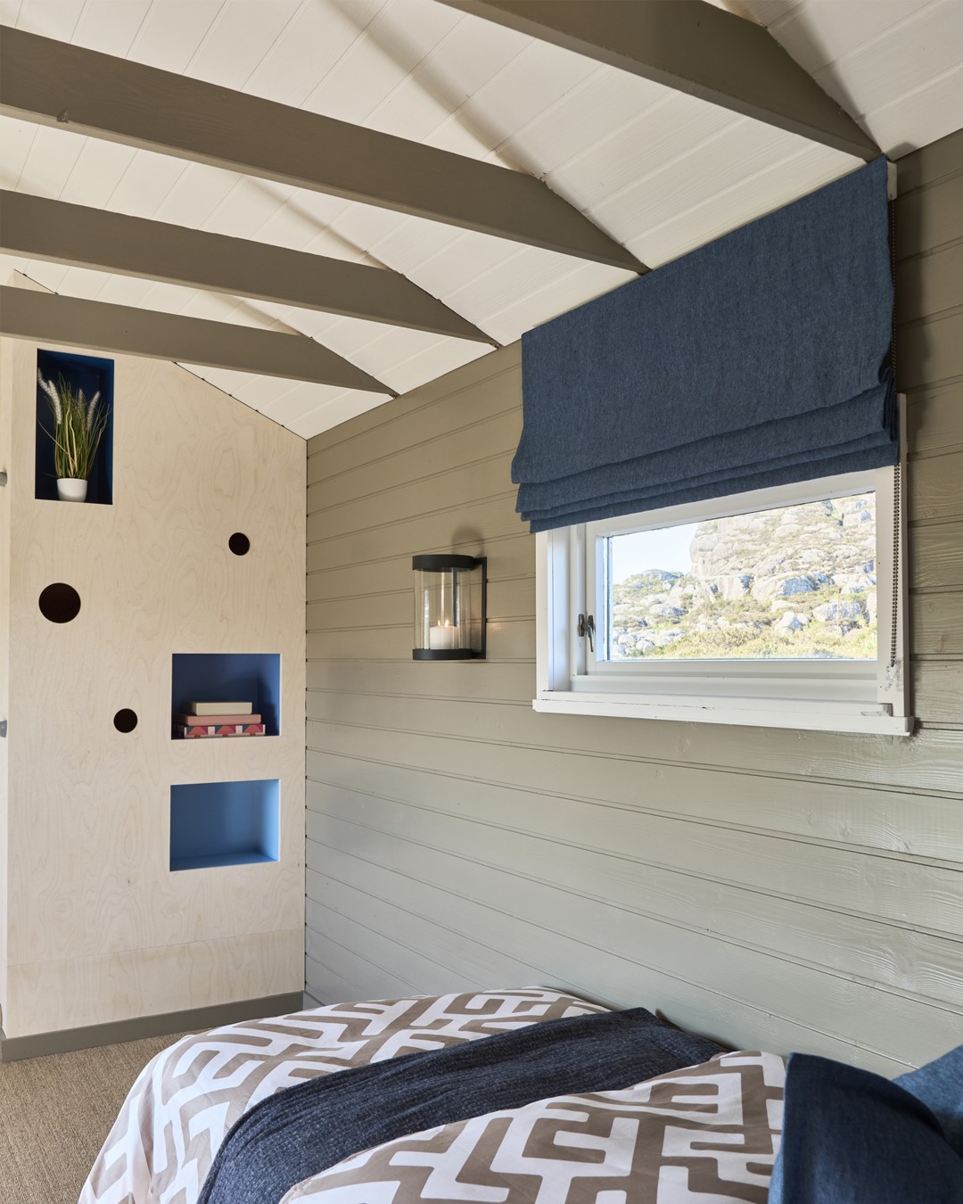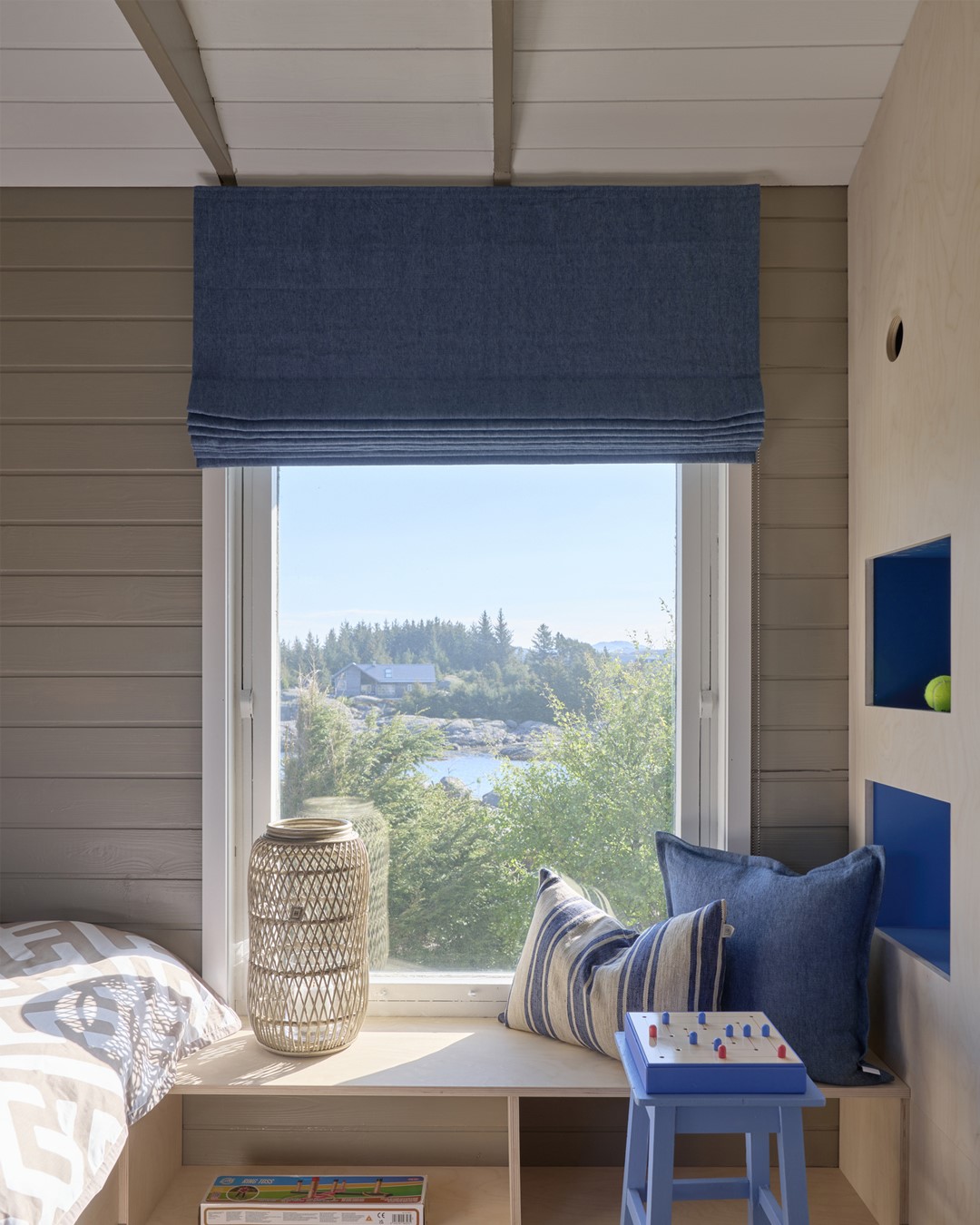 Halvor Bakke & Co oppgraderer hytta i Portør med gardiner, liftgardiner og puter i en mønstermix av nye tekstiler fra Ian Mankin.