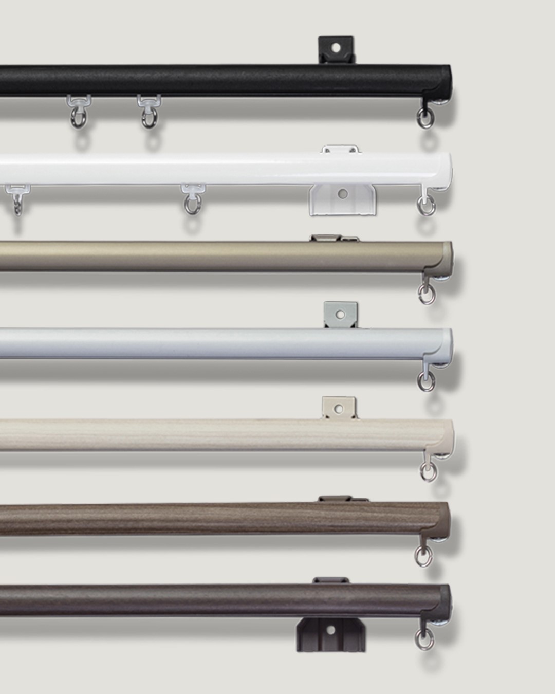 Nexty gardinskinne i 7 valgfrie farger for montering på vegg eller i tak, som leveres både som enkel eller dobbel skinne og med 90 graders buer til innvendig hjørneløsning.