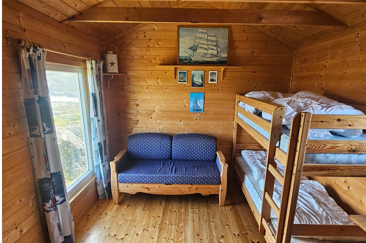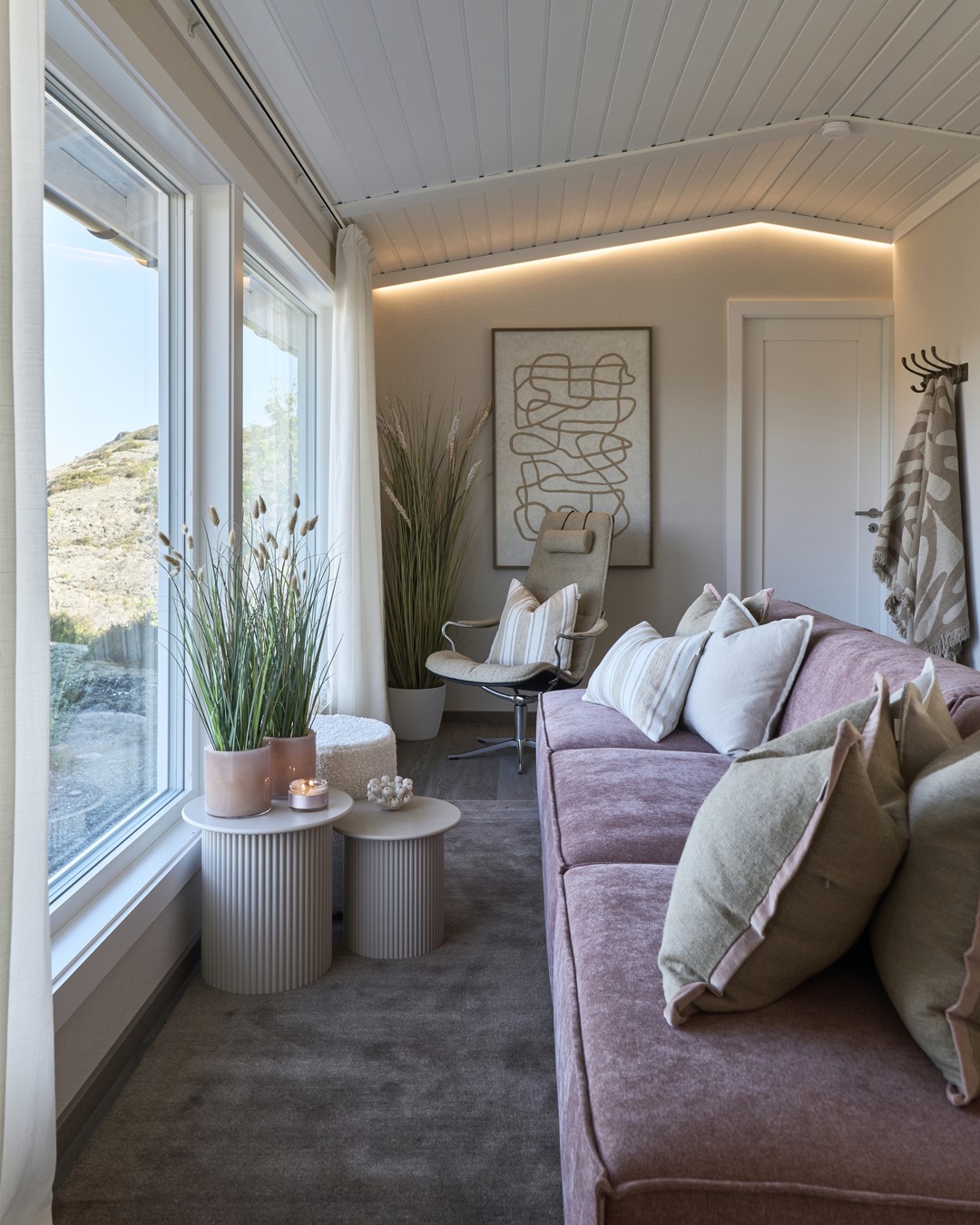 Med lyse gardiner til brun vegg og grønn liftgardin gir Halvor Bakke & Co hytta i Sulitjelma både et praktisk og estetisk løft. Bli med inn!